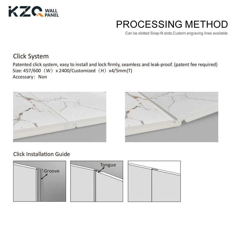 แผนผนัง SPC มีความหนา 4 มิลลิเมตรและ 5 มิลลิเมตร ทําให้มันเหมาะสําหรับความต้องการการติดตั้งที่แตกต่างกัน ระบบติดตั้ง Unilin Lock ทําให้มันง่ายในการติดตั้ง ประหยัดเวลาและความพยายามการออกแบบหินคลิกของกระเบื้องผนัง panel SPC เป็นสะดวกสําหรับการติดตั้ง DIY บนผนัง, และมันยังสามารถใช้เป็นพื้น